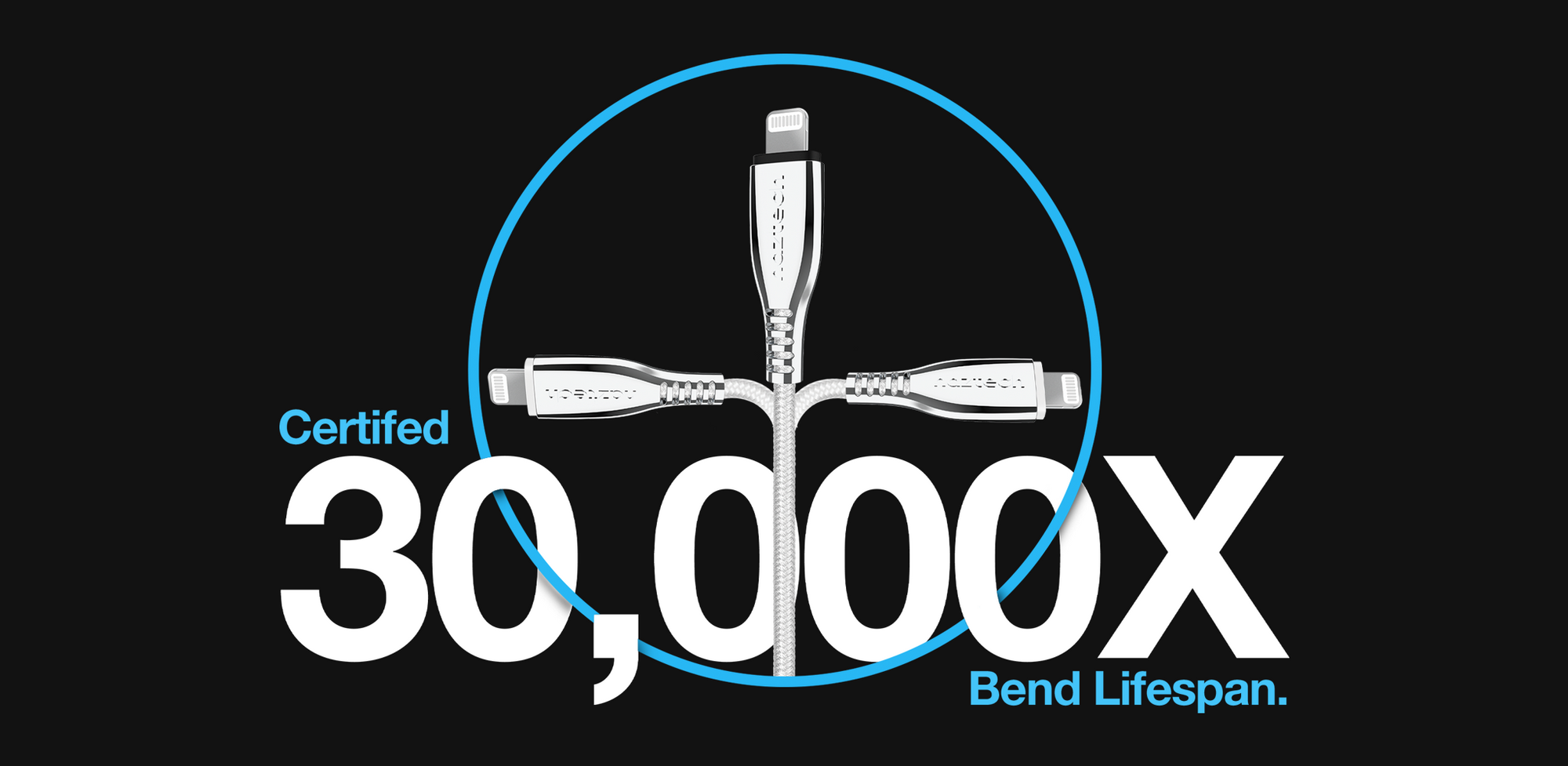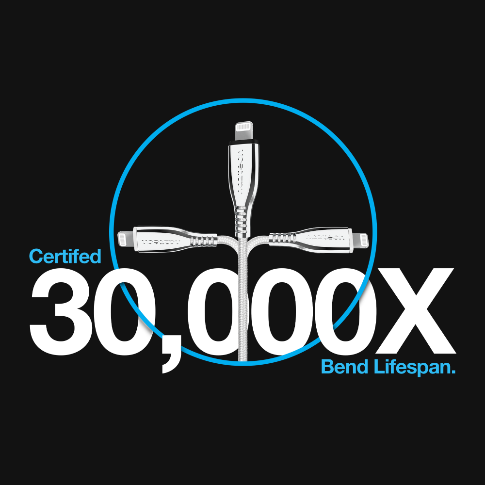 Reinforced stress points, indestructible ballistic braided nylon construction, and thick gauge wiring deliver an unrivaled 30,000X bend lifespan, ensuring that this cable can stand up to frequent daily use and repeated unplugging.