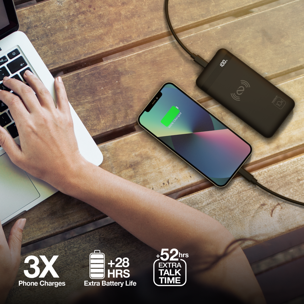 The PowerBolt Power Bank recharges through a built-in Lightning® connector input, allowing you to use the same cable as your iPhone, iPad, or AirPods to charge the power bank. With a high capacity 10,000mAh battery, enjoy 3 full phone charges and up to 52 hours of extra talk time on the go!