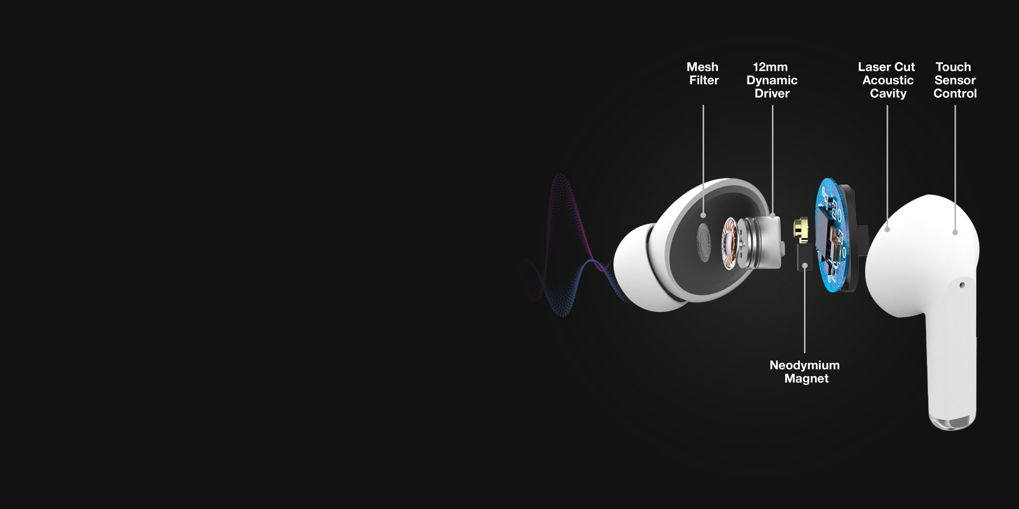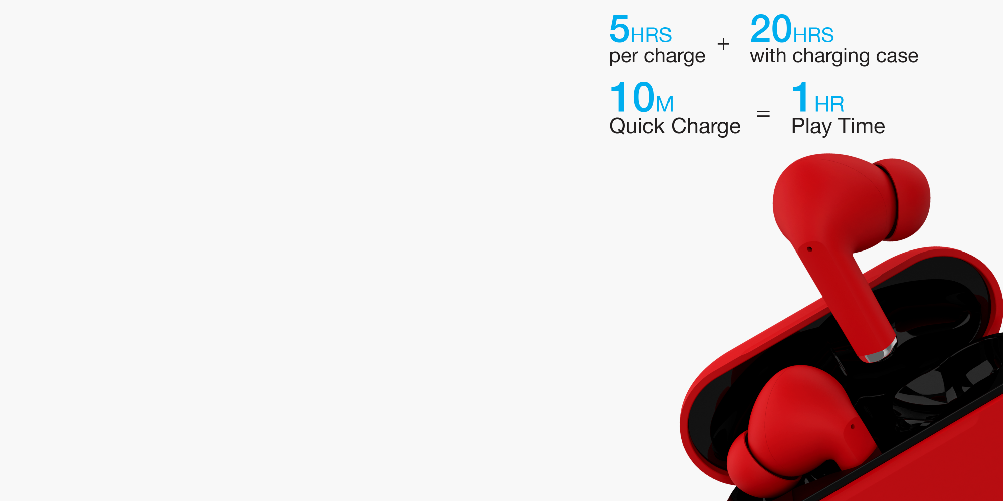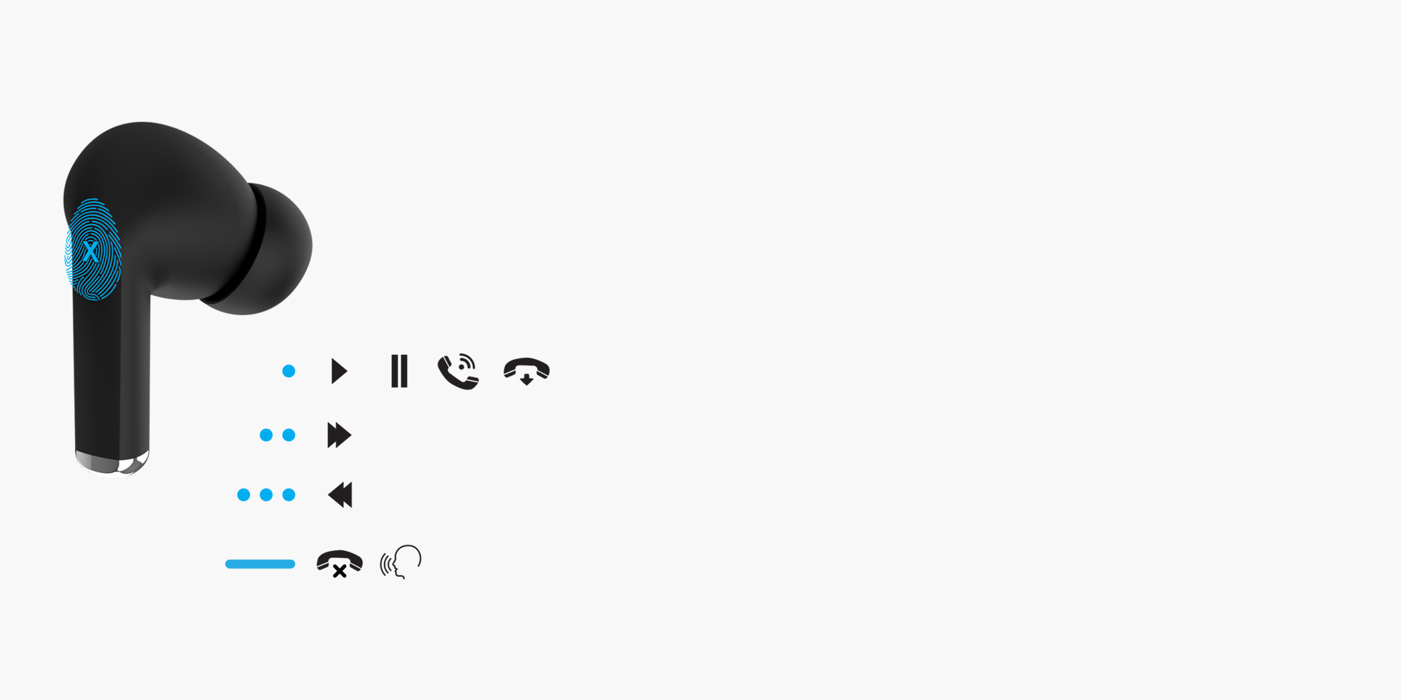 Touch the Control Zone on both earbuds at the same time, and hold for 5 seconds. You’ll hear “Power On”, and the earbuds will turn on and connect to your device.