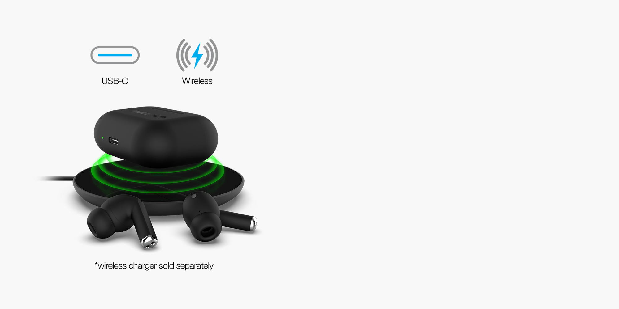 for Wired Charging – the charging case requires a maximum wired charging output of just 5W. This means you can charge the case with any USB charger, regardless of the charger’s power level. USB charging technology regulates the charger’s power output, which ensures the case does not get overpowered.