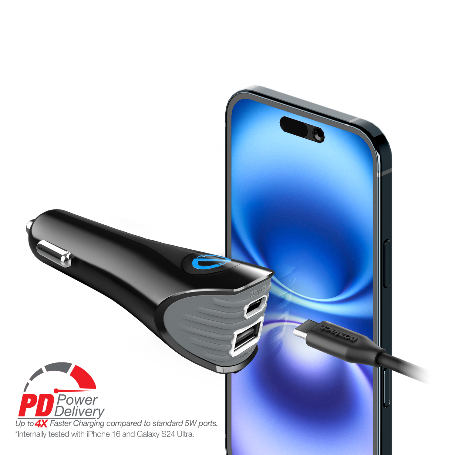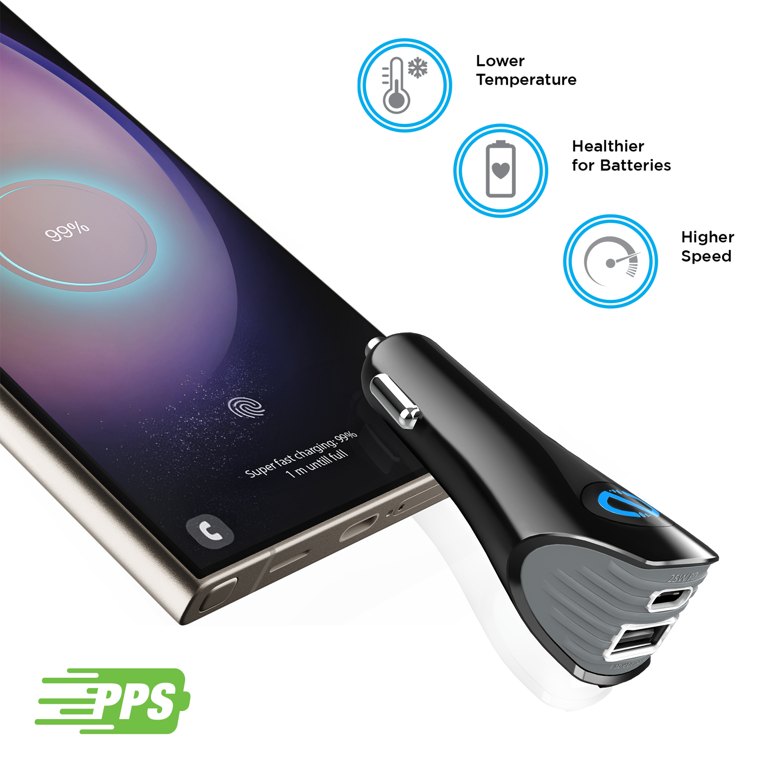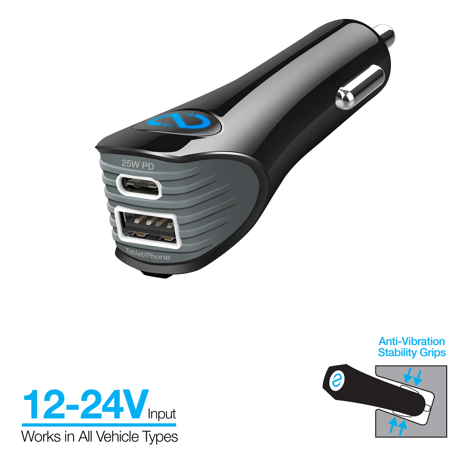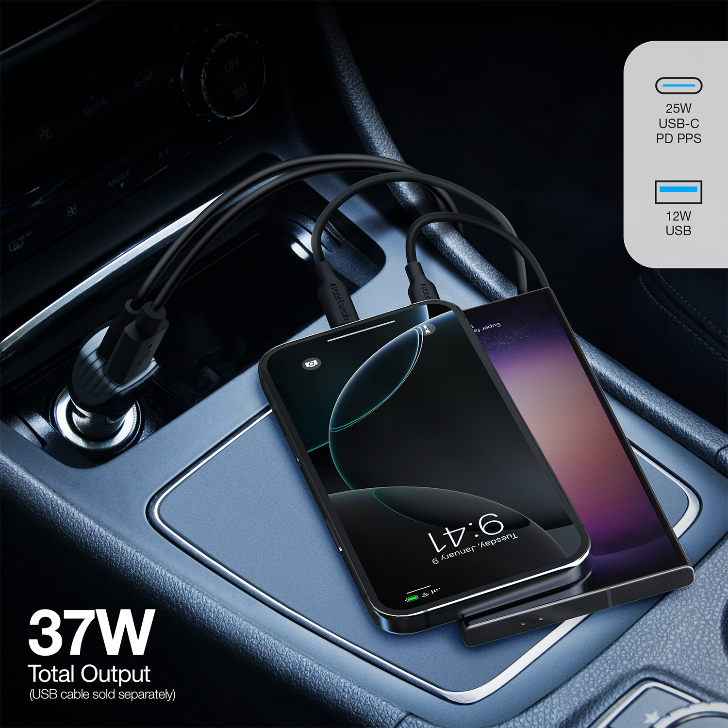 The secondary 12W high-speed USB port runs on its own circuit, so it doesn’t take power from the 25W port. You get a guaranteed super-fast charge for your phone while you simultaneously power up any second device – whether it’s your tablet, your earbuds, or your passenger’s phone.