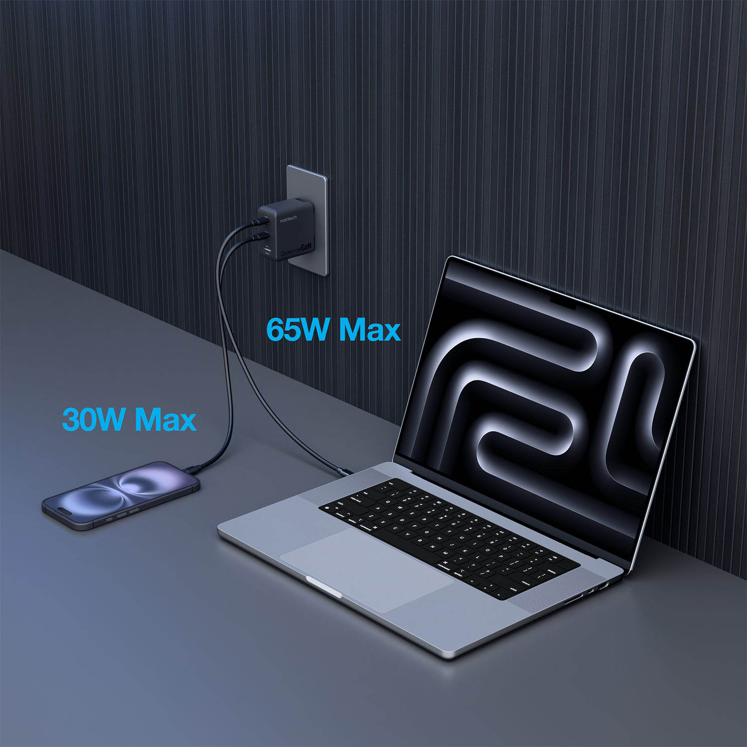Charge your laptop or other high-power device with up to 65W output from the top port while also fast charging your phone or tablet with up to 30W output from the middle port.