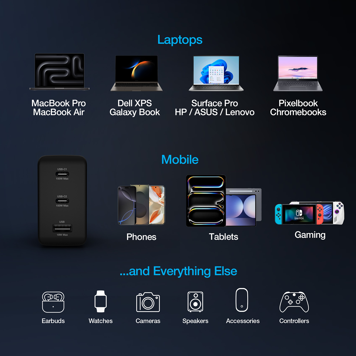 Get high-speed charging for laptops, tablets, and phones, and plug in to a worry-free charge for smaller tech like earbuds, smartwatches, and gaming devices.