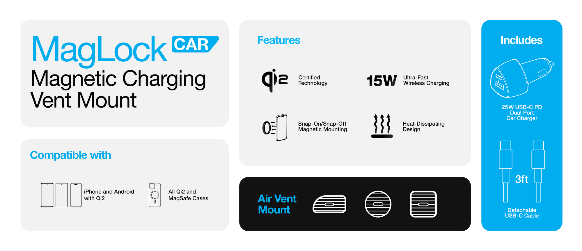 Comes with a 3ft detachable USB-C cable and a 25W USB-C PD car charger. The car charger has an additional 12W USB port, so you can charge a second device at high speed while you drive.