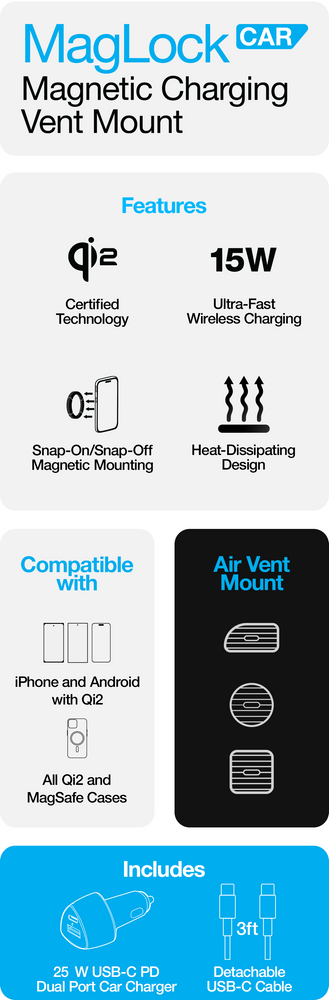 Qi2-certified to deliver 15W ultra-fast magnetic wireless power to all Qi2-enabled iPhone and Android devices. Charge an iPhone 16 Pro from 0 to 25% in just 30 minutes, cable-free!