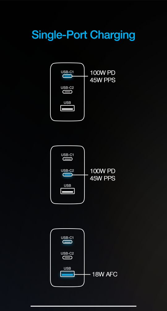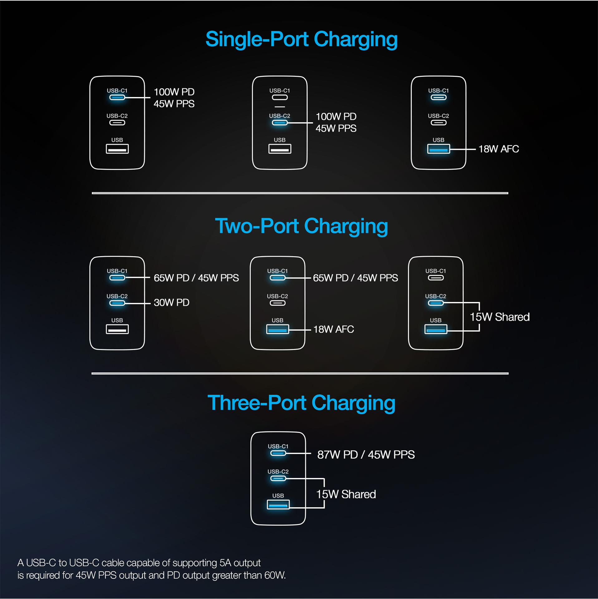 Get max-speed 100W output when charging a single device from either USB-C port.