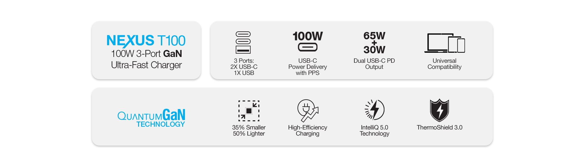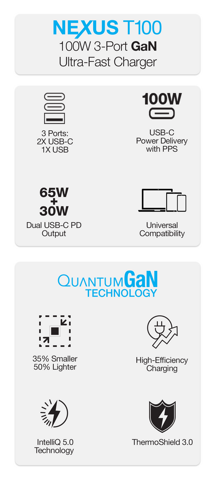Nexus T100 combines three ports and 100W of power into an ultra-compact design that is 35% smaller than a single-port 96W MacBook Pro charger.
