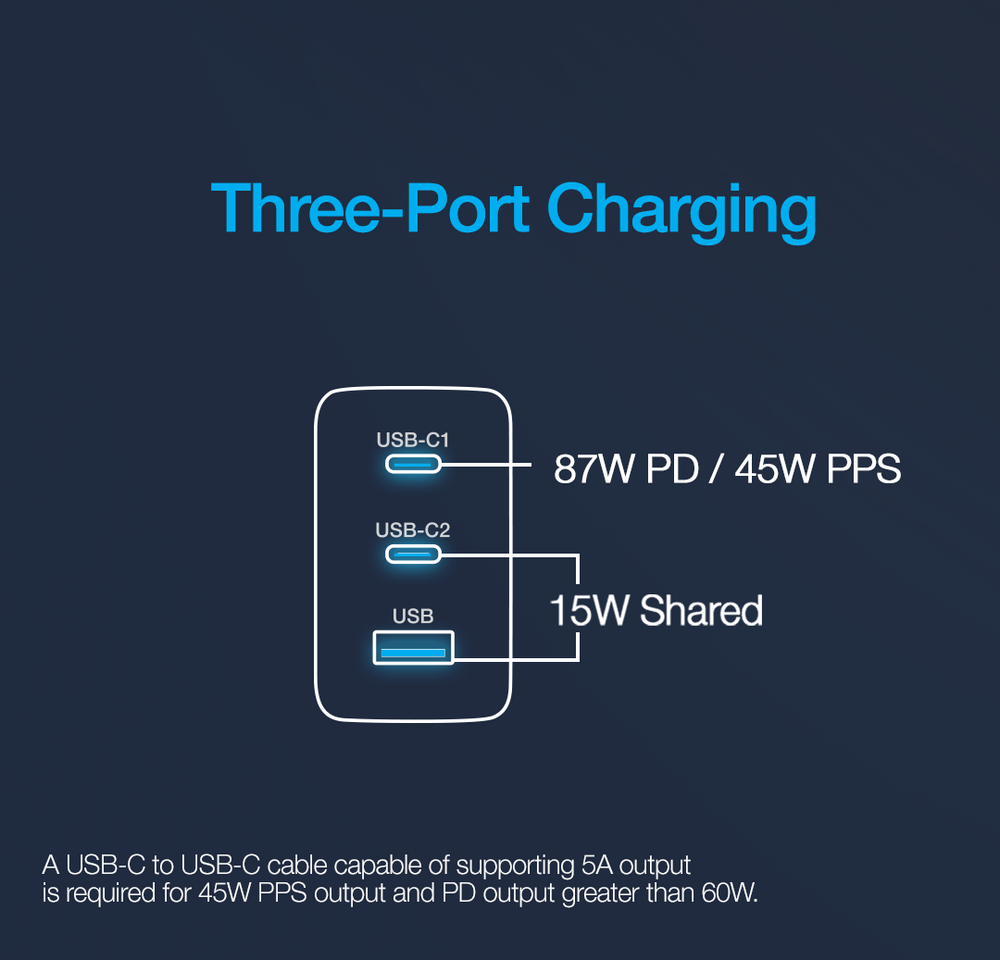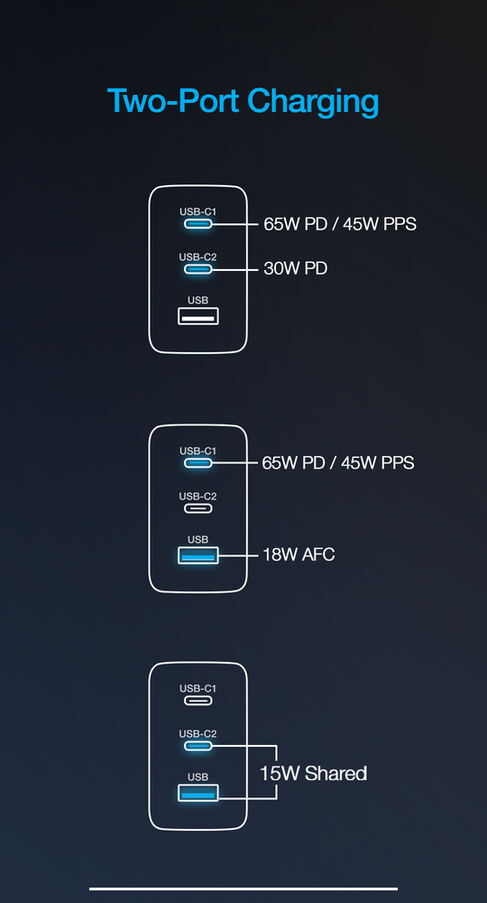 Charge your laptop or other high-power device with up to 65W output from the top port while also fast charging your phone or tablet with up to 30W output from the middle port.