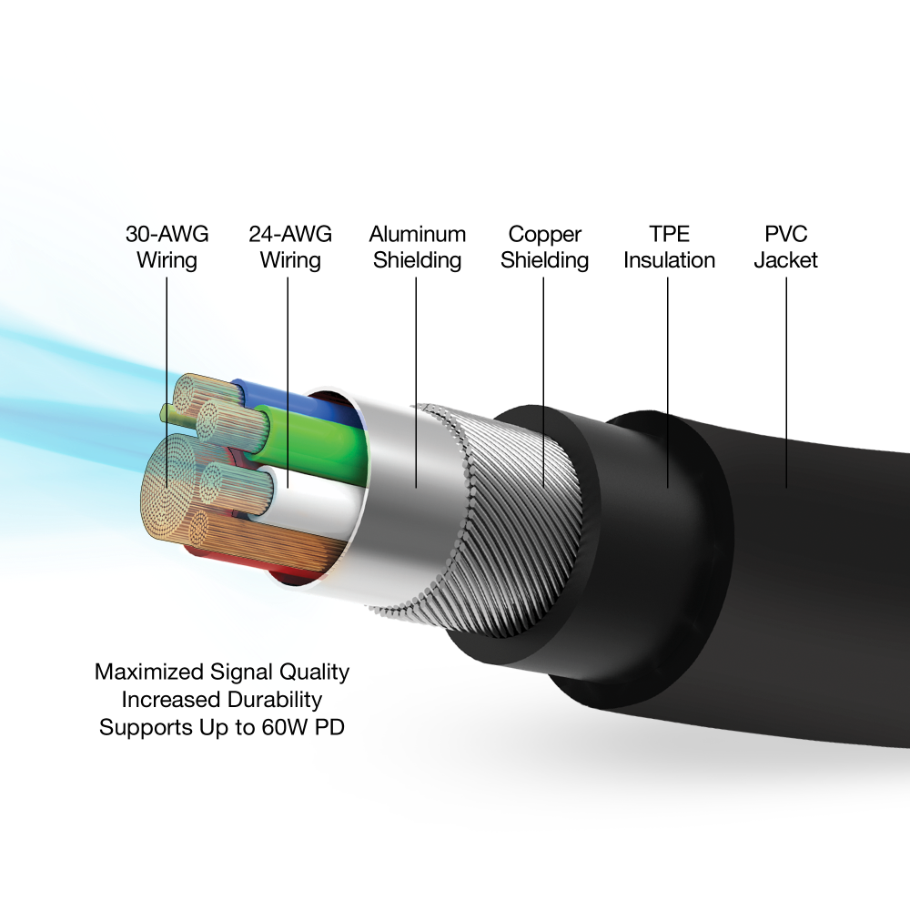 High-purity copper signal wire and thick ground conductors guarantee ultra-fast and reliable communication between your devices. Transfer music, pictures, and data in seconds, and simultaneously pass-through charge your devices with support for up to 60W of Power Delivery output.