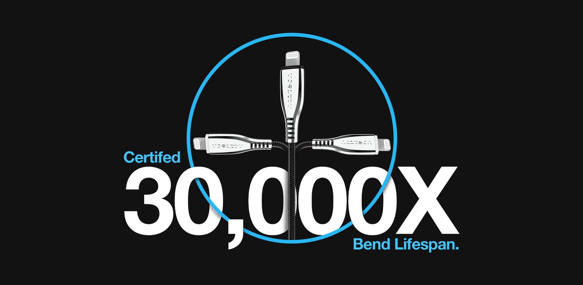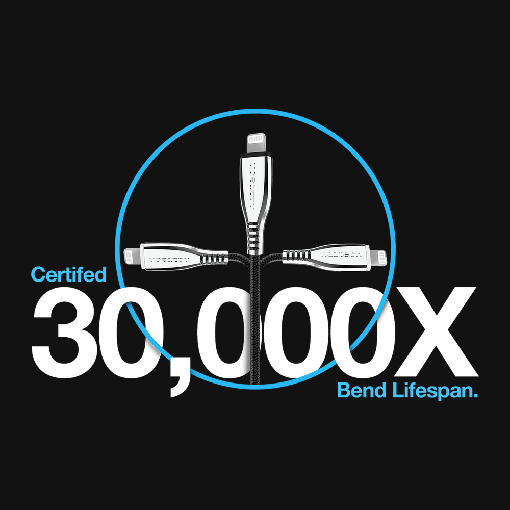 This cable is 5X tougher than any standard-issue options. Reinforced stress points and thick gauge wiring that offer an unrivaled 5,000-bend lifespan.